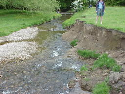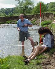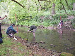 Depth and width of channel were measured at 24 gauging points taken at regular intervals downstream. Can you see any downstream changes in river characteristics from the photographs? Look for meandering, increasing width and depth of channel.